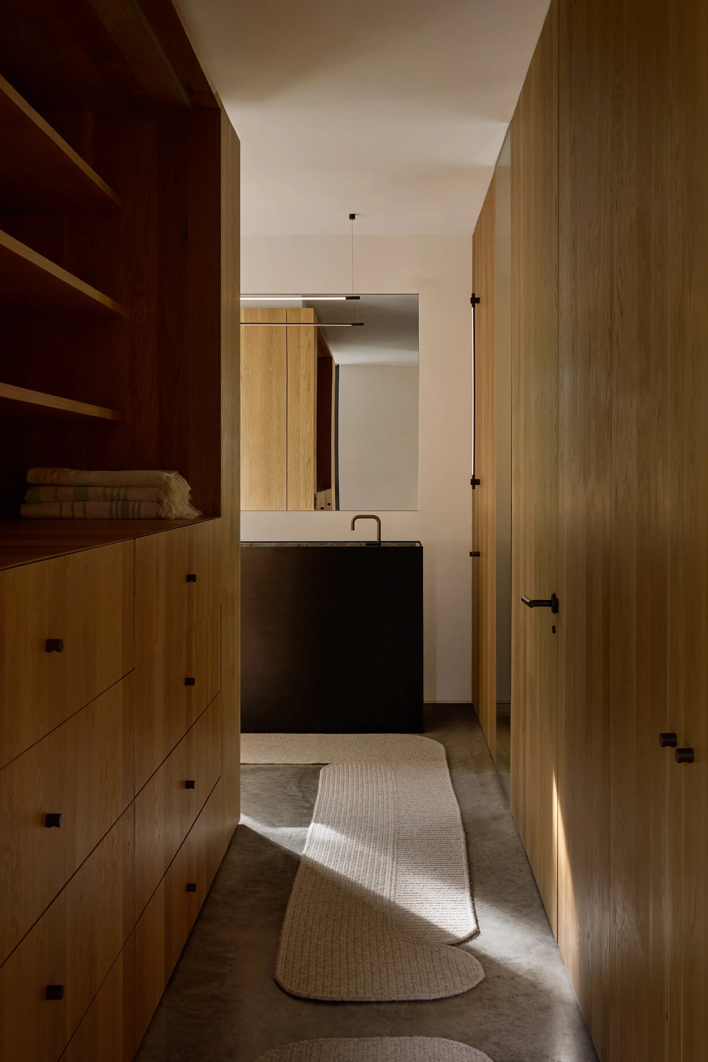 A custom Pool Rug in the restful primary bedroom of a Seattle residence designed by Ore Studios. Photo Credit: Haris Kenjar.