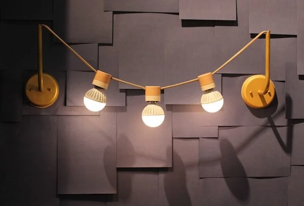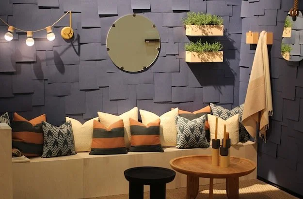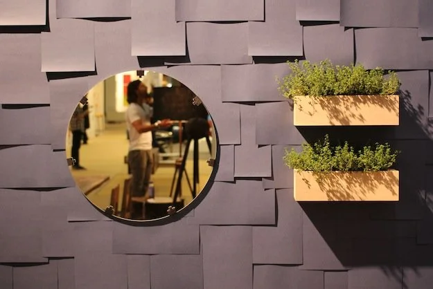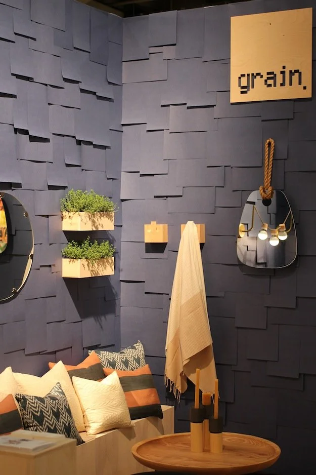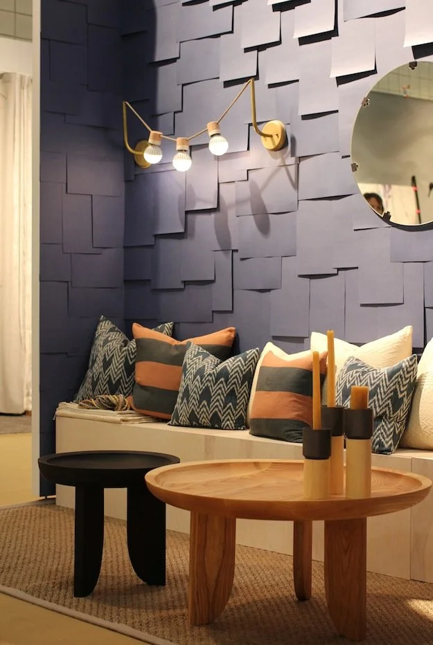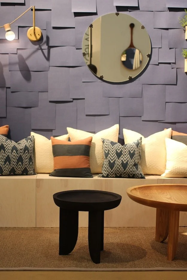 Above and below is a view for those who weren't able to make it. We had the same booth as last year but decided to pump up the color a little with denim blue cotton paper "shingles" that we stuck up with packing tape the two nights before. Pieces on display include our Hitch mirror, Hook, new textiles from Guatemala, Dish side and coffee tables, Stick candle holders, Stitch mirror, and Strung sconce for Standard Socket.