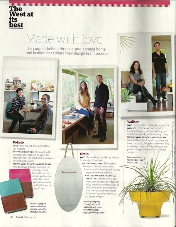 Made with Love Jan 20 Written By Chelsea Minola Huge thanks to Jess Chamberlain of Sunset for including us in her recent piece on couples that run design businesses together. Also included were our friends Angie Myung and Ted Vadakan from Poketo and Linda and Max Geiser of Wallter. Chelsea Minola