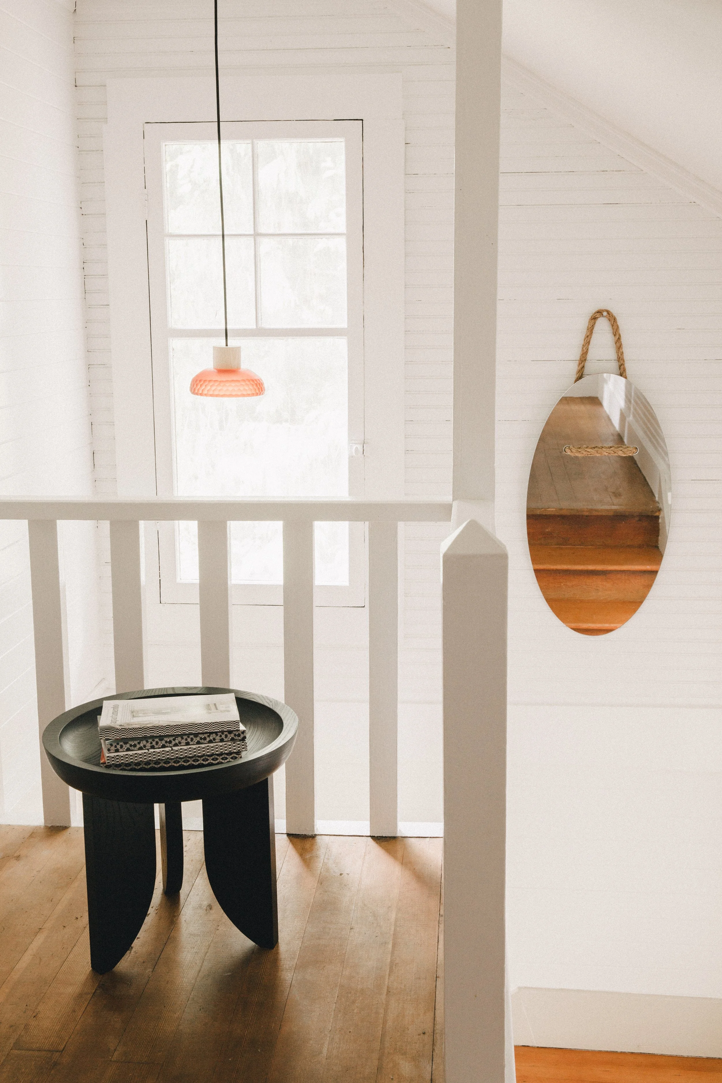 FSC certified American ash, blown glass, brass hardware and cloth covered cord.