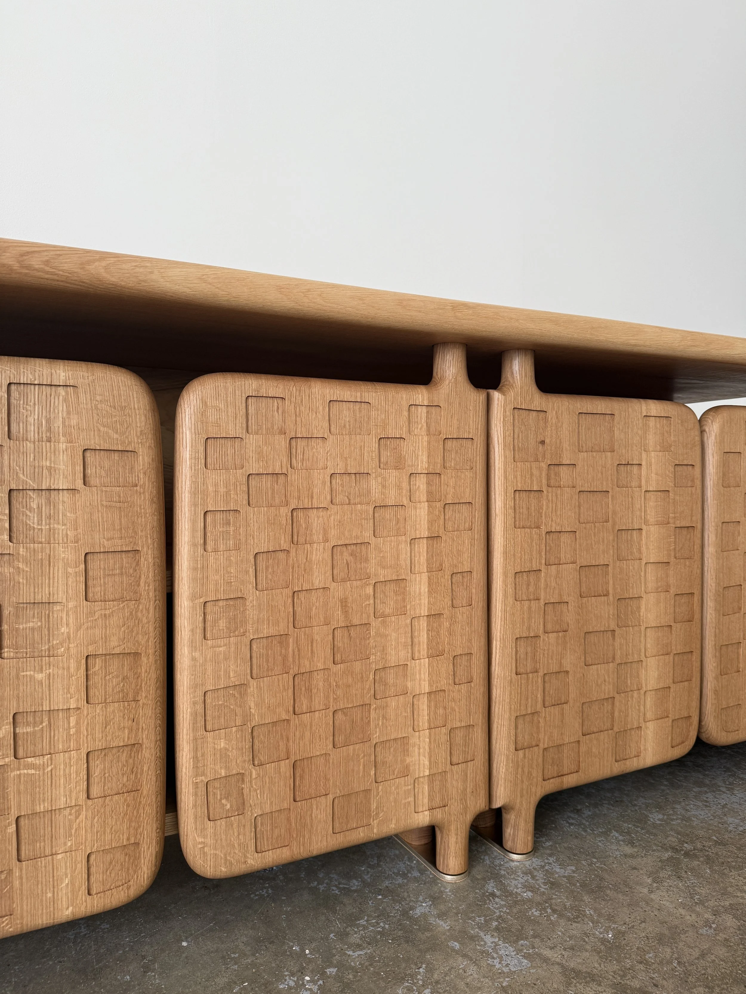 Taking inspiration from a collection of hand carved tables, a scooped out tabletop with a sloping underbelly is created with a little help from technology. This series explores how shaped tabletops in dimensions suited for contemporary life can be milled to avoid warping or cracking over time. The result is a sculptural form that is striking and memorable.